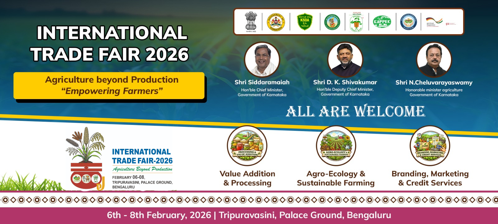 In order to double the income of farmers in the State, there is a need to provide appropriate platform to establish market linkages to farmers by showcasing value-added products, natural products and other related products under various schemes implemented by the Secondary Agriculture Directorate, the Department of Agriculture and the Watershed Development Department, Karnataka Agro Products Processing and Export Corporation (KAPPEC), Karnataka State Seeds Corporation Limited (KSSC) and Karnataka Pulses Development Corporation. This initiative will also create awareness among farmers, consumers and other stakeholders, and facilitate access to national and international markets. The Department of Agriculture, Government of Karnataka, successfully organized Organic and Millets International Trade Fairs in 2017, 2018, 2019, 2023, 2024 and 2025. These events attracted a large number of stakeholders, generated significant interest and achieved notable success.The fairs included high-quality exhibitions, international conferences, producer–marketer meetings, farmer workshops, organic and millet food courts, and consumer-connect events, all of which contributed to overall sectoral development.